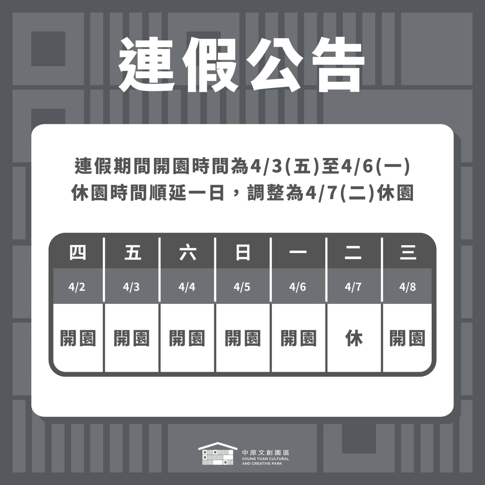 4/3(五) 至 4/6(一) 開園