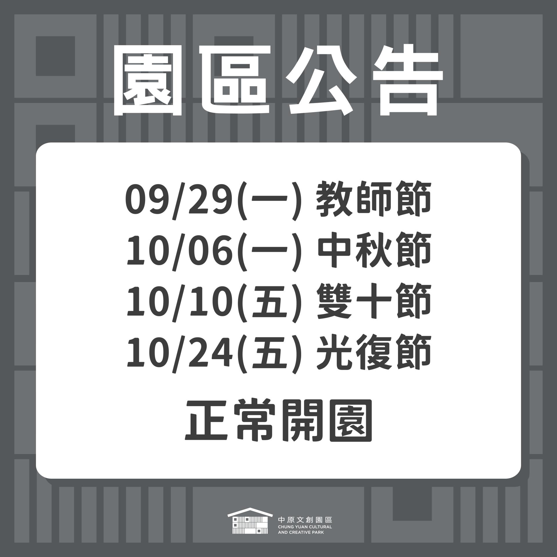 中原文創園區固定週一休園,若遇國定假日,將順延至週二休園